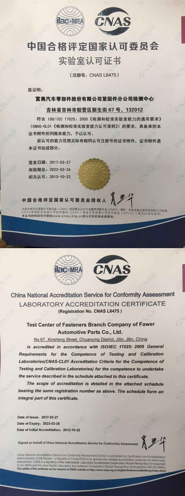 国家实验室认可证书
